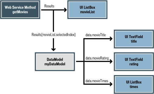 Every bindable property of the DataHolder component, including the built-in property data or any other property you add, works as follows: you can assign any type of data to a DataHolder property, either through data binding or using your own ActionScript code. Whenever you do, the DataHolder component emits an event whose name is the same as the property, and it executes any bindings if appropriate.